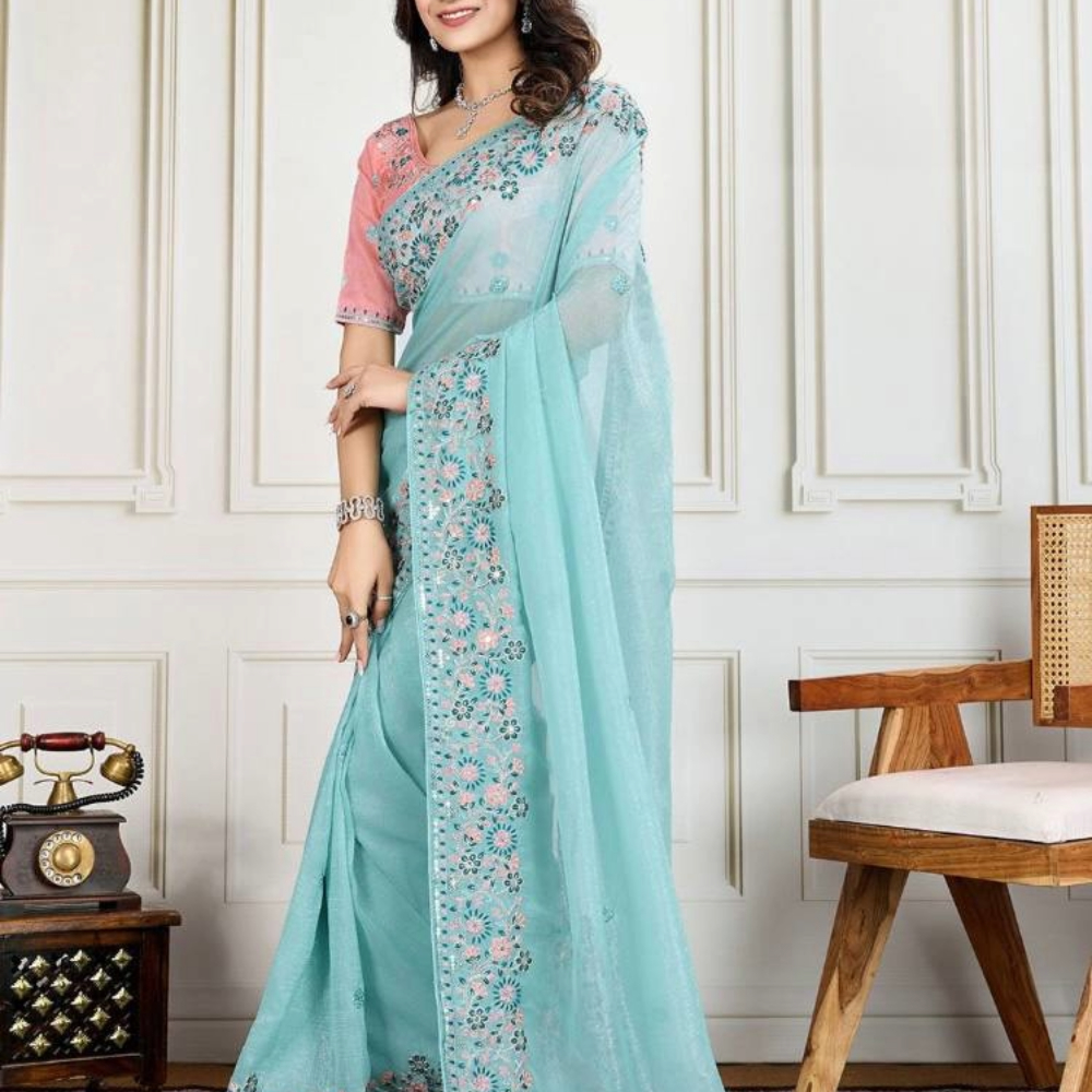 Perfect for festive occasions, weddings, or special gatherings, this saree combines traditional grace with modern elegance. The soft fabric drapes effortlessly, offering comfort and style throughout the day. Pair it with statement jewelry and heels to complete the look.